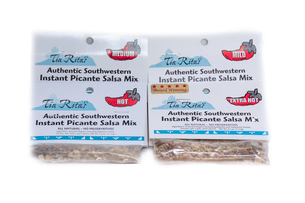 Our instant picante salsa mix is the perfect addition to anyone’s pantry. Each package makes about a pint of salsa when mixed with a 14 oz. can of tomatoes or 2 cups of fresh tomatoes. You can also mix it with sour cream or beans for a dip, avocadoes for guacamole, or cheese for chile con queso. Available in Mild, Medium, Hot, and our award-winning Extra Hot. Or try our Muzzle Blast Salsa Mix for more of a red chile flavor.